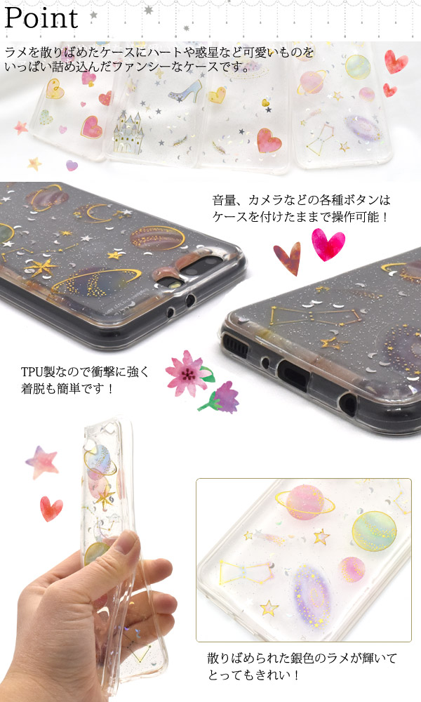 ラメを散りばめたケースにハートや惑星など可愛いものを