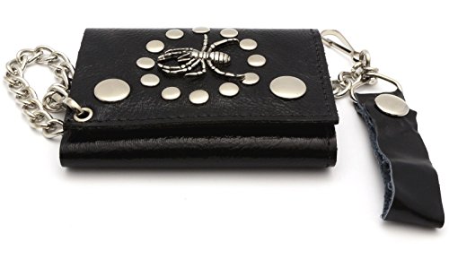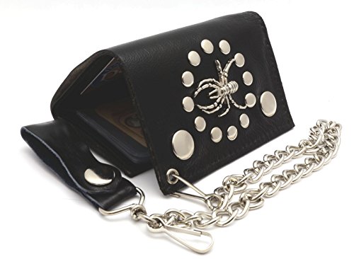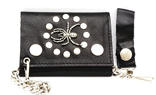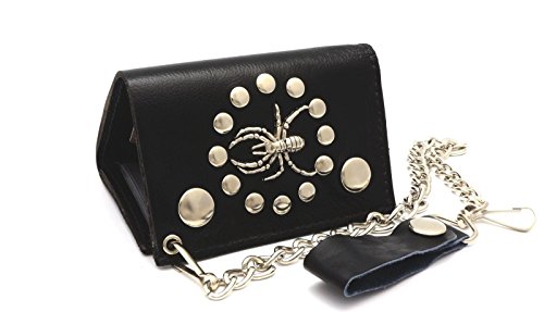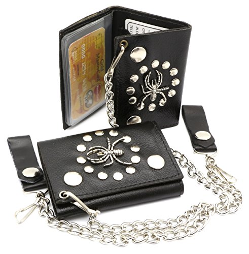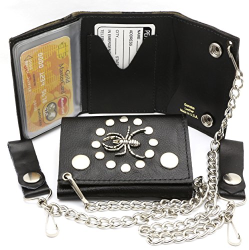 Product Description Trifold Black genuine leather biker wallet with a Metal Spider design and a chain. Includes clear sleeves for pictures or cards and a center pocket for cards. The wallet is fastened with 2 snap buttons. The chain is removable. 0