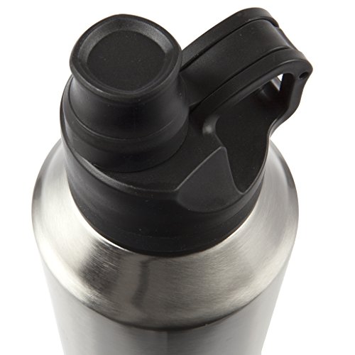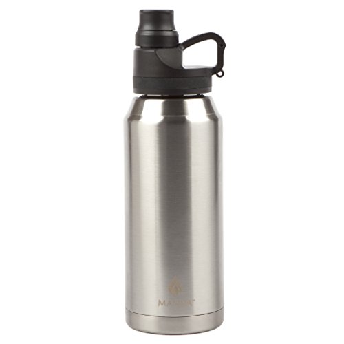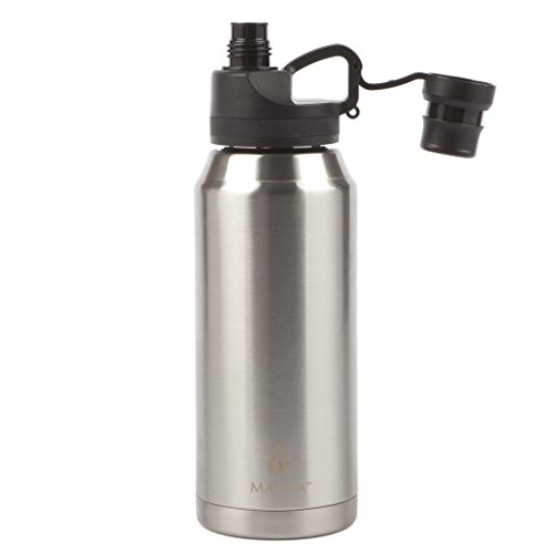The Manna Jumbo double wall vacuum insulated bottle is made from food-safe 18/8 stainless steel. The lid features two openings, a larger opening to make refilling and cleaning quick and easy, and a smaller locking lid for pouring or drinking without spilling. The insulation keeps liquids hot for 8 hours and cold for 12, ideal for hiking, camping, or tailgating.