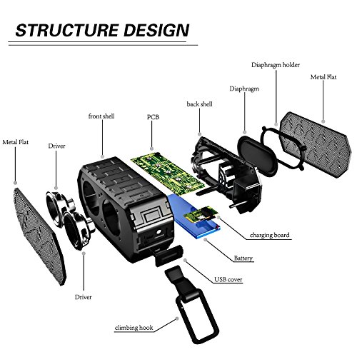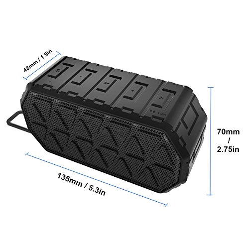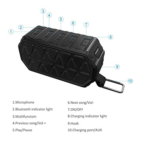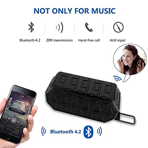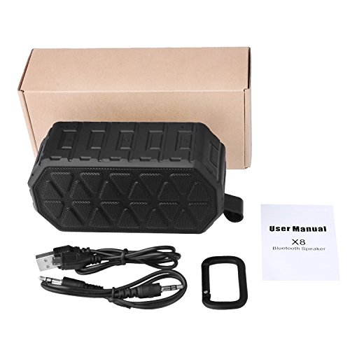 Studio : YIIYAA Publisher : YIIYAA Binding : Electronics Product Description IP67 Waterproof Shockproof Bluetooth Speaker cases and interface design ensure dustproof, mudproof, shockproof, rainproof, snowproof, level up to IP67, can be used under harsh environment such as, outdoor and shower. Play time up to 10 hours Portable bluetooth speaker built-in 1000mah battery, which means you can play music up to 10 hours at the volume of 70%, a greater battery life time than most of the speaker. Super Sound Speaker Implemented with 7W loudspeaker in the little device which offer impressively clear, crisp sound. Loud and power enough to fill your bedroom, office and anywhere you want. Save Your Hand Free No matter enjoy bathroom or outdoors time, the double built-in MIC and hands-free function can let you enjoy wonderful music without the hassle of long cable and set free your hand from answering a call. Fit All Place It supports any Bluetooth-enabled devices such as iPhone, iPad, Samsung Galaxy/Note/tablet, HTC and so on), PDA, tablet PC, iPad, Mac Air, MP3 players, PCs, laptops, etc. Specification: -Material:TPU ABS -Bluetooth profile: CSR V4.2 -Input: DC 5V±0.25V/ 500mA -Distance: 20M/65.6FT(In open area) -Frequency: 2.402GHZ-2.448GHZ -Speaker: (4Ω 5W*2) 10W -Standby time: > 3000H (Bluetooth is connected) -Standby current: < 1MA -Charging Time: 3-5H -Paly time: > 24H -Talk Time: > 24H -Net weight: 300g Package Include: 1 * Bluetooth Speaker 1 * USB Charging Cable 1 * 3.5mm Audio Cable 1 * User Manual 1 * Climbing hook 0 |
