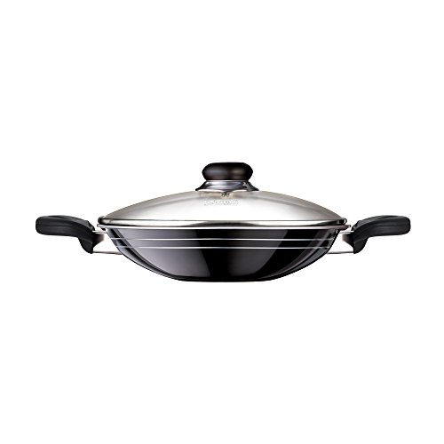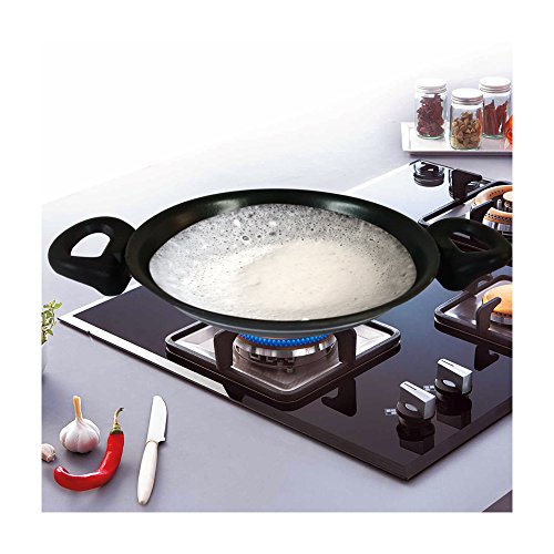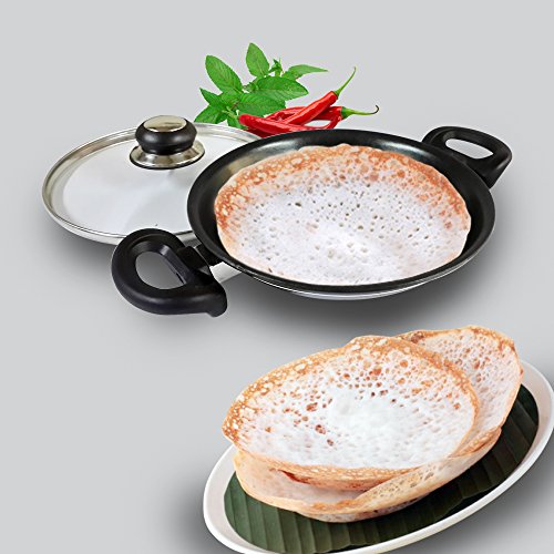 This "hopper" / appam pan also known as appachatti is great for making soft & crispy appams. Made from thick aluminium and coated with teflon platinum nonstick coating not only improves performance but also increases durability. The "stay-cool" handles are fitted strategically to avoid heating while using this pan. The concentric groves at the bottom ensure even distribution of heat. The toughened glass lid with steam vent ensures that you can see how your "hopper" / appam is cooking. Suitable for use with all cooktops except induction. After use, wait for the product to cool and you could wash it with warm soapy water or put it in the dishwasher. "Hopper" / Appam pan is delivered in a well-designed boxFeature
