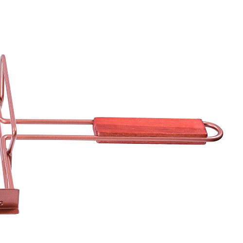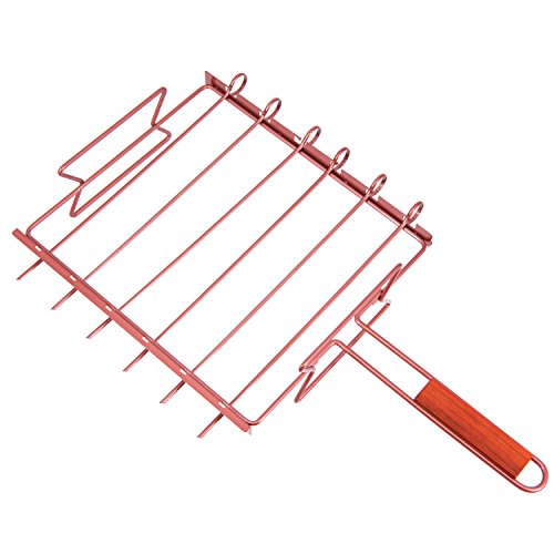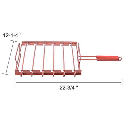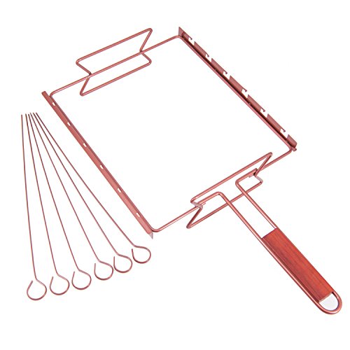 Notches are designed to keep skewers in place and wood handles are comfortable to hold. Keep it balance and hold with two iron handles after food cooling