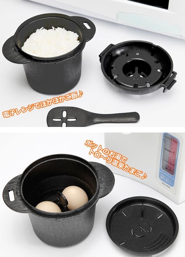 電子レンジでご飯を0.5~1合炊け、おかゆも作れます。ご飯を茶碗に1杯ぐらい食べたい時などに便利です。たまごスタンドを使えば、ポットのお湯(保温90度)でトロ~リ温泉たまごも作れます。 |