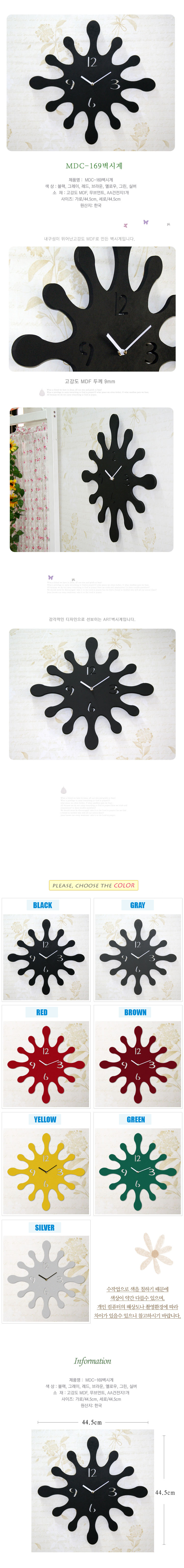 INFO Material : high-solidity MDF, Movement Size : 44.5cm x 44.5cm x 0.9cm Contents : Clock, AA Battery 1ea Origin : Korea