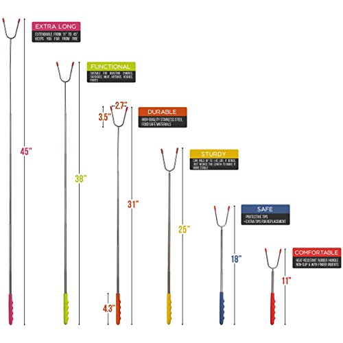 - UNPARALLELED SAFETY – The telescopic forks set or Marshmallow Sticks set keeps you at a safe distance from fire/heat while you enjoy roasting in the backyard, during camping or any other cookouts. Moreover, the use of high heat resistant material on the handles prevent heating of the handles and thus prevents inconvenience and burns. The forks also come with RUBBER TIPS to help you store and carry them along safely – additional rubber tips included for replacement!