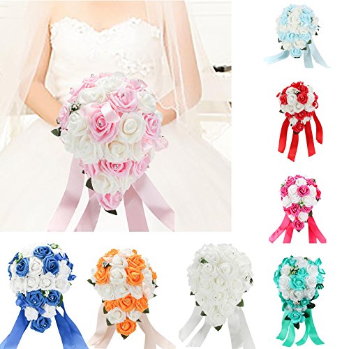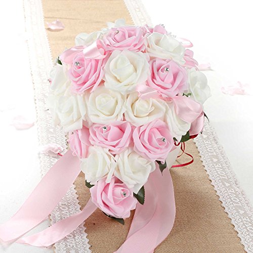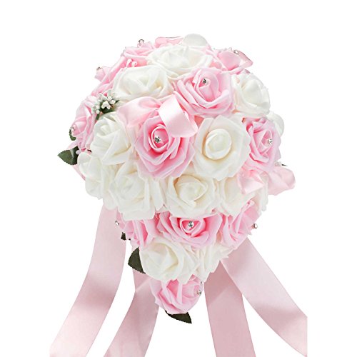 vLoveLife Wedding Bouquet Mix White & Baby Pink Artificial PE Rose Flowers Bridal Bridesmaid Bouquets Handmade Posy Pearl Rhinestone Plant Leaf Vine Decor