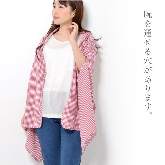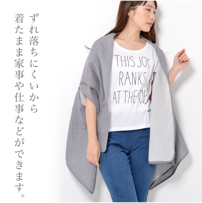 腕を通せる穴があり、ずれ落ちにくいから着たまま家事や仕事などができます。