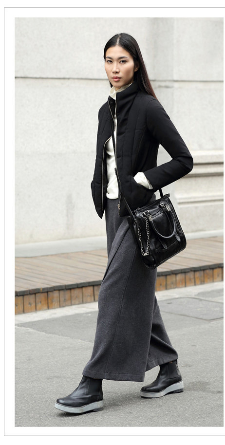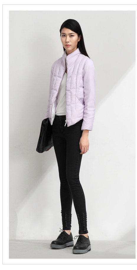 这款羽绒服色彩素雅清丽,线条及简大方,