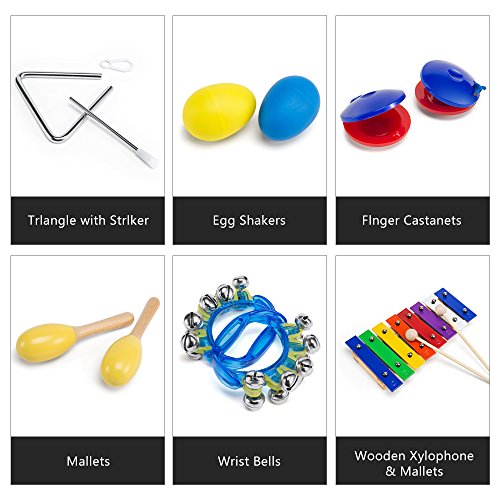 -. Feature : DEVELOP CHILDREN'S INTERESTS .Various Musical Instruments provide a wide range of beautiful sounds, which is attractive and helpful to cultivate kids' sensitivity to music ,improve creativity, and develop kids' interest in music,early elementary children in group or individual play. / PERFECT DESIGN OF MUSICAL INSTRUMENTS SET. This 11 Pcs musical instruments is very colorful, It includes all kinds of instruments, like Wooden Xylophone, Wood Sounder, Tambourine, Wrist Bells, etc, which is suitable for both individual and group play, so it will bring a lot of fun to kids. / SAFE AND RELIABLE FOR CHILDREN. Approved by US monitor, the toys sets made of nontoxic and high quality material,and It is Safe and Suitable for young children ages 3 and up. / GREAT CHISTMAS TOY GIFT FOR KIDS.It's great for kids as Christmas presents,which is colorful and attractive to kids,so it will bring a lot of fun to kids. / INDIVIDUAL PACKAGE.Come with a complete rhythm instrument set in zippered carrying bag, convenient to carry and clean up storage.children will love it. Fit for both boys and girls.