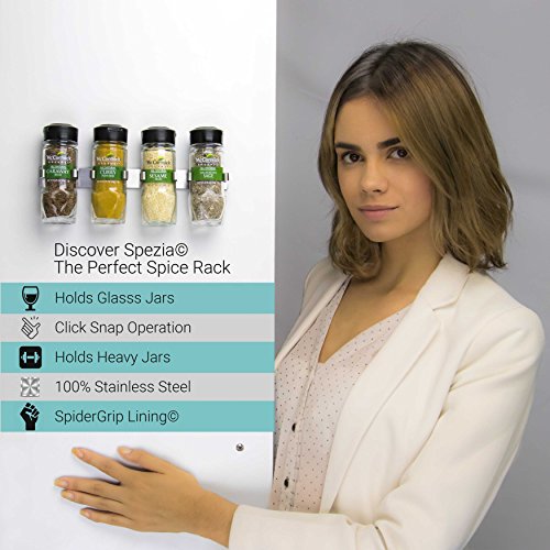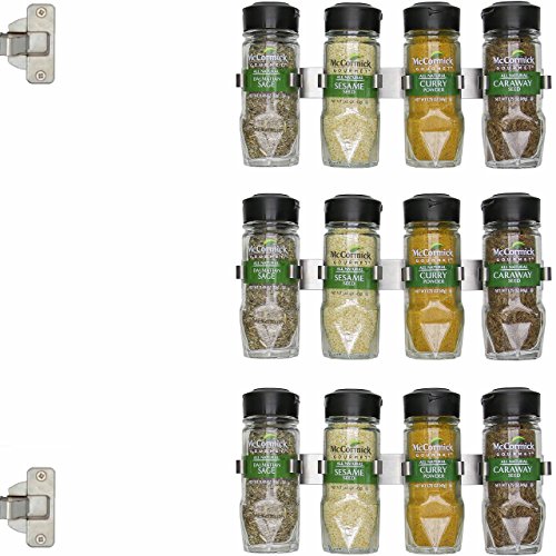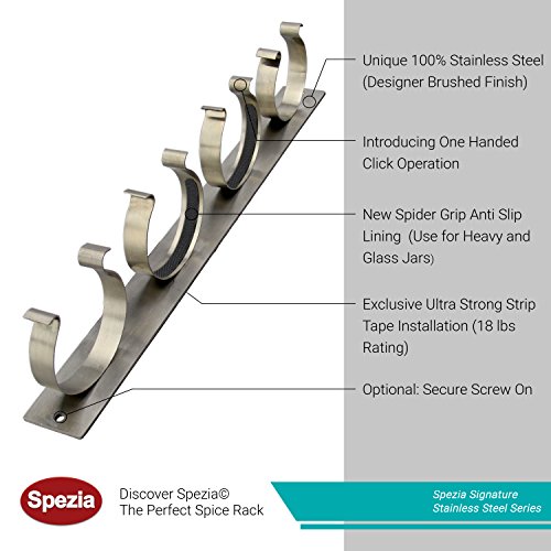 Spezia Unique Stainless Steel Designer Anti Slip Spice Rack, Elegant Wall or Door Mount Spice Organizer, SpiderGrip Special Gripper Lining, One Handed Operation, Set of 3 (12 Jars)