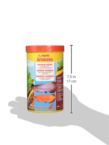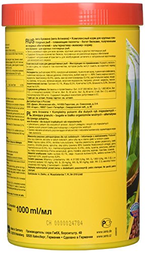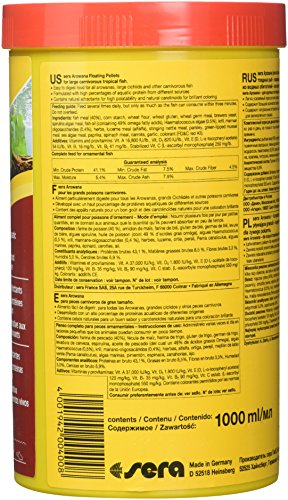 Sera Arowana is the staple food consisting of carefully manufactured granules for big carnivorous fish such as Arowanas and bigcichlids. The easily digestible food is particularly attractive due to its high percentage of aquatic proteins (40% fish). The meaty chunks are enthusiastically accepted even by extremely choosy predatory fish that otherwise prefer live food. The valuable natural carotenoids from Spirulina, Haematococcus and Krill support the optimal color formation. The floating granules keep their shape and do not pollute the water.Feature