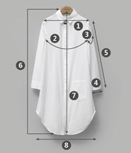 | 尺码 | ①肩宽 | ②胸围 | ③袖臂围 | ④袖口围 | ⑤袖长 | ⑥前衣长 | ⑦后中长 | ⑧下摆围 | ||