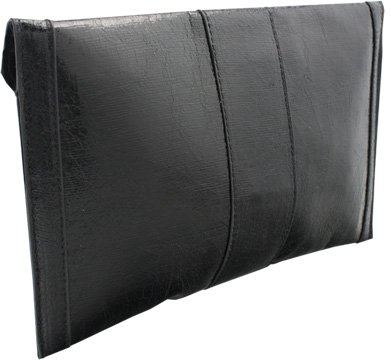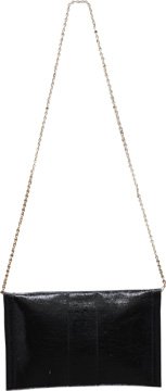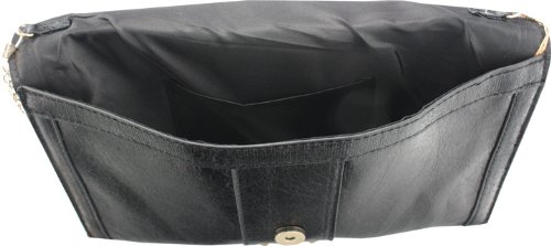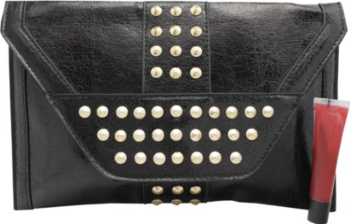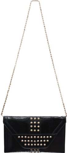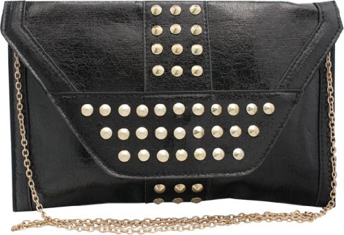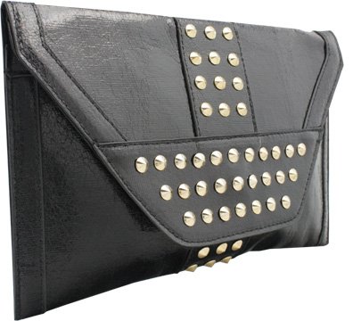 Day or night grab on to this metallic fold over envelope clutch with magnetic closure and studded detail.