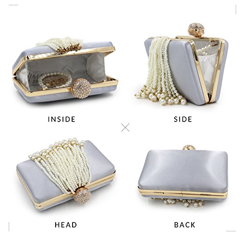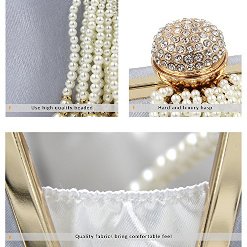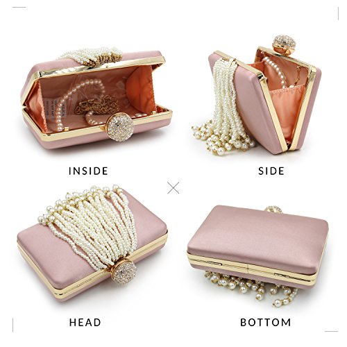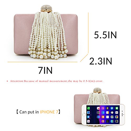 -. Feature : [ Feature ] The pearl tassels are naturally and compactly perpendicular to the surface. The clasp was decorated by mini rhinestones. / [ Material The entire structure is made of superior hardware frame construction, the main fabric is made from simulation silk satin which feels soft and comfortable when you take it. / [ Flexible ] The removable chain-strap for you to choose clutch it in hand or hung on the shoulder. The proper chain length also can be to cross your body. / [ Capacity ] Nice size can fits in iPhone 6s, cash, card, key and cosmetic. / [ Occasion ] Elegant design is best choose for you to Wedding, Banquet, Cocktail Party, Prom, Dating.