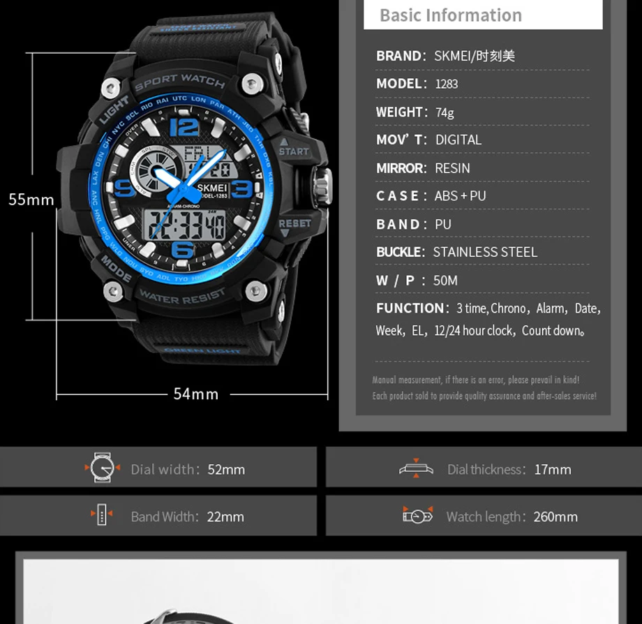 Feature:Alarm,Auto Date,Stop Watch,Week Display,LED display,Shock Resistant,Water Resistant,Back Light