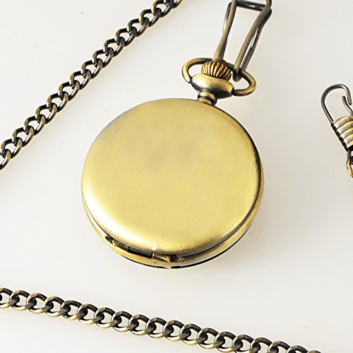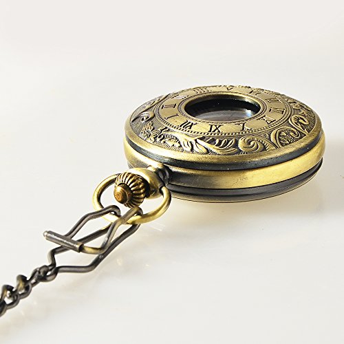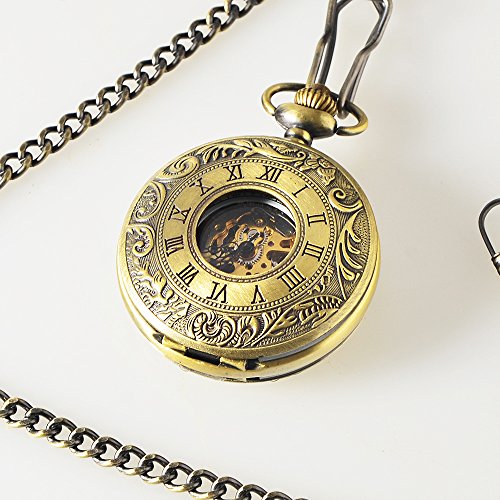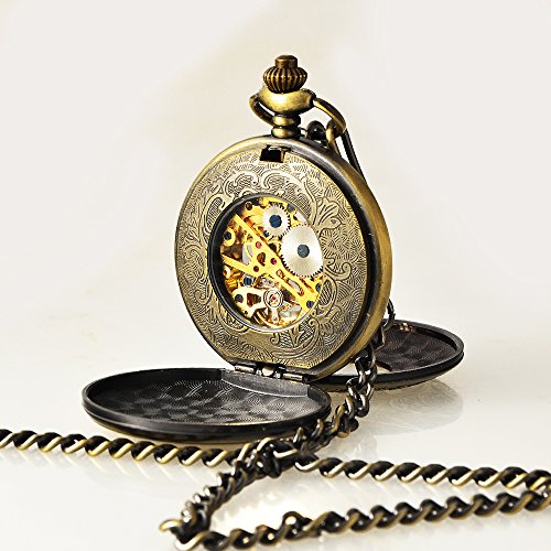 -. Feature : Unique skeleton dial with black roman numerals and hands / Bronze color alloy double hunter design / Mechanical movement ( manual winding ) / 12-hour Dial / Includes 31cm chain