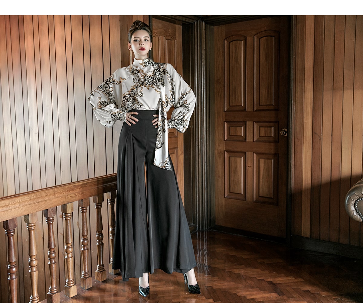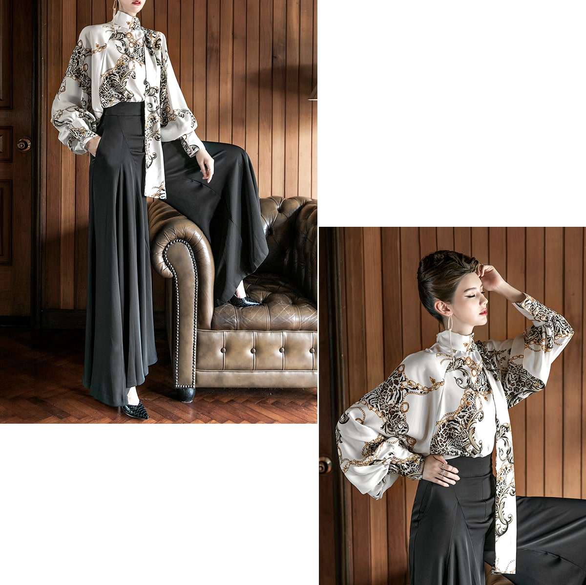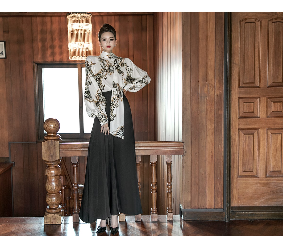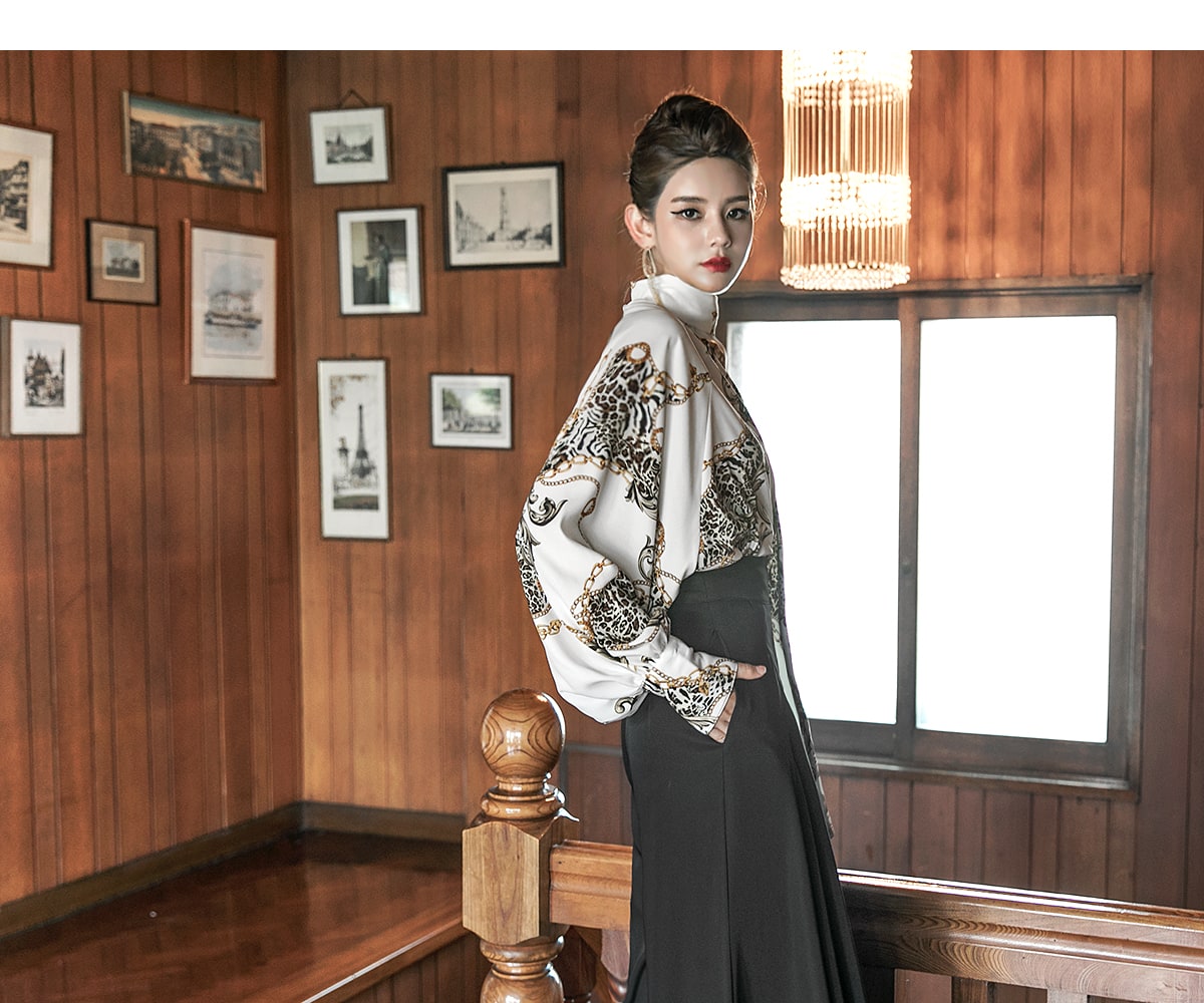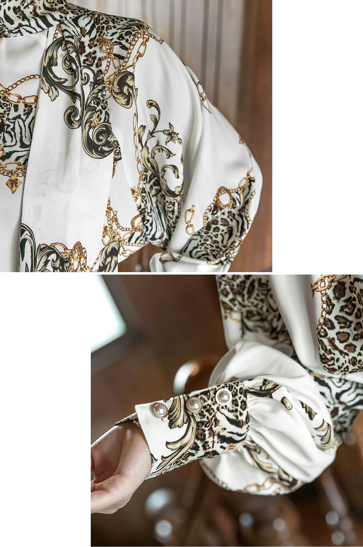 B9010 애니멀 체인 나염 타이 블라우스 Ivory mix
