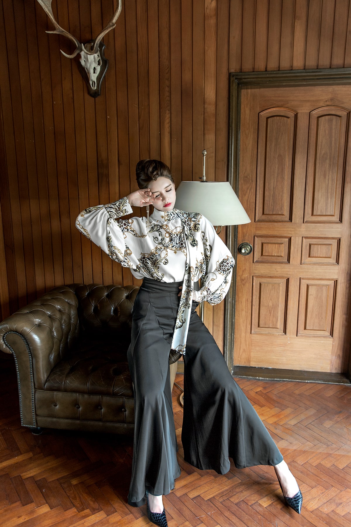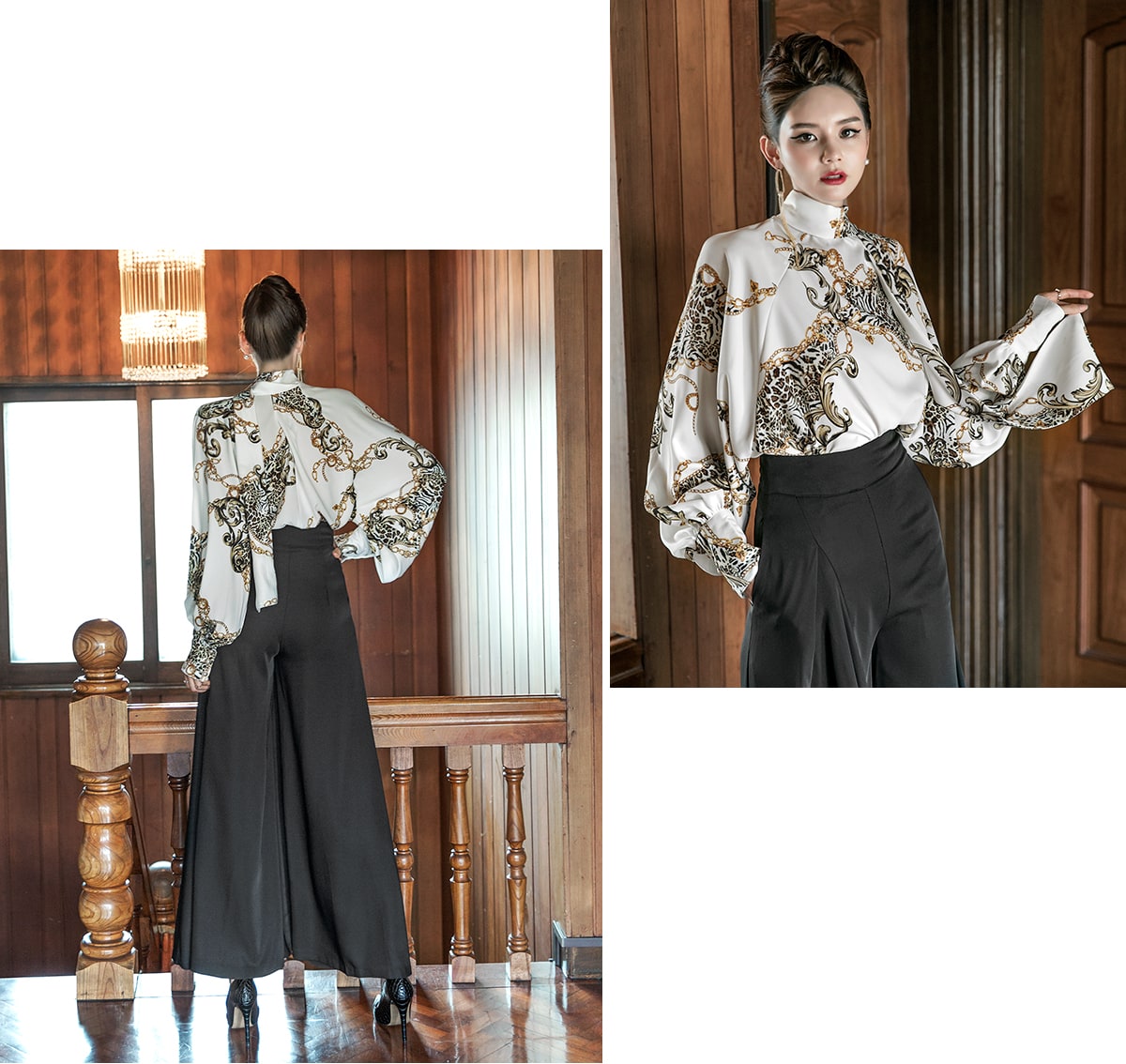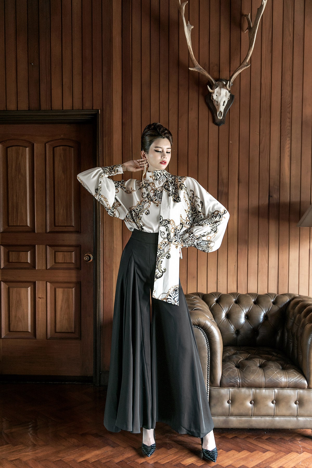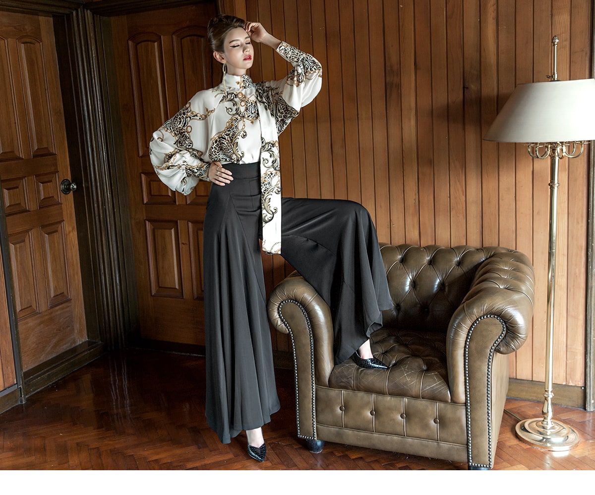 B9010 애니멀 체인 나염 타이 블라우스 Ivory mix