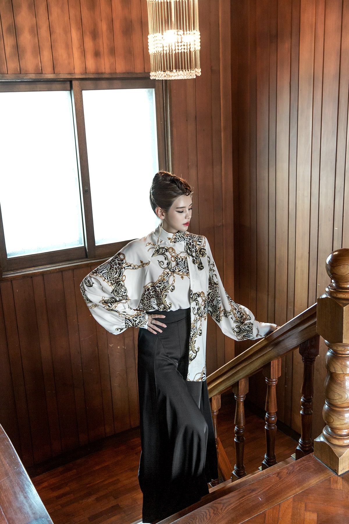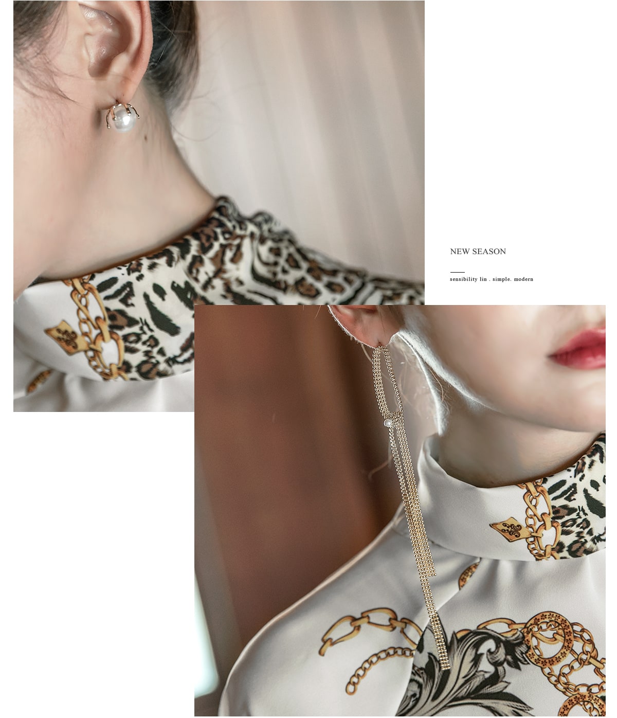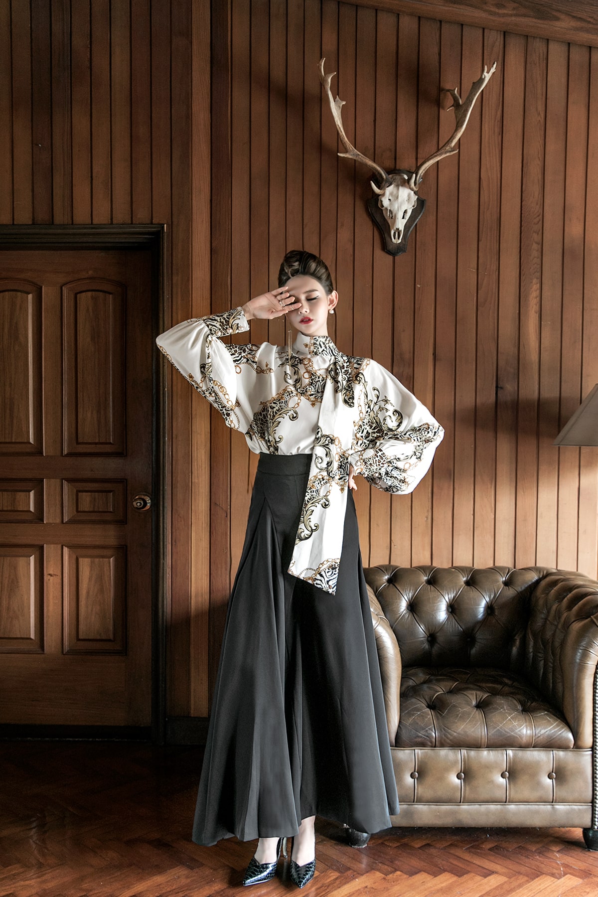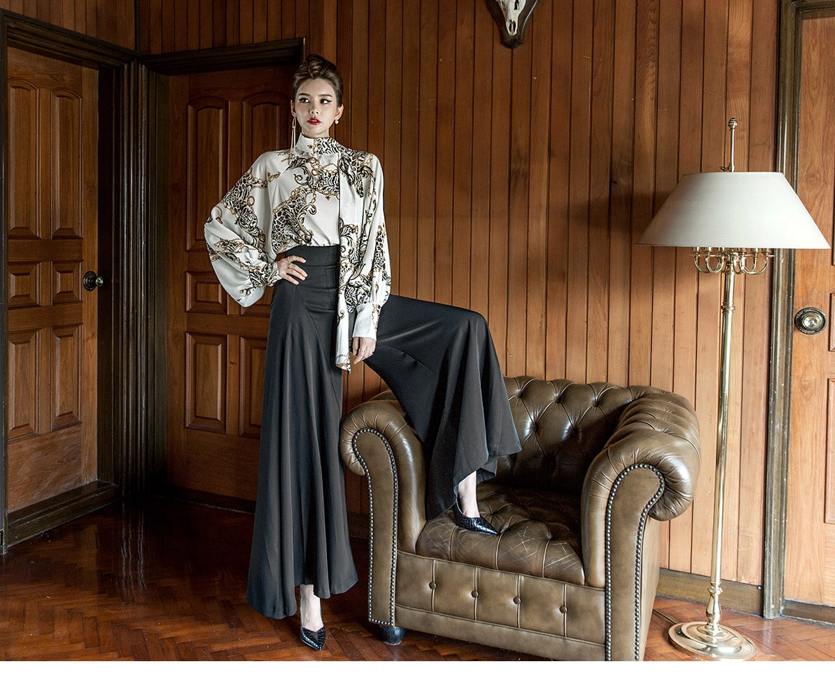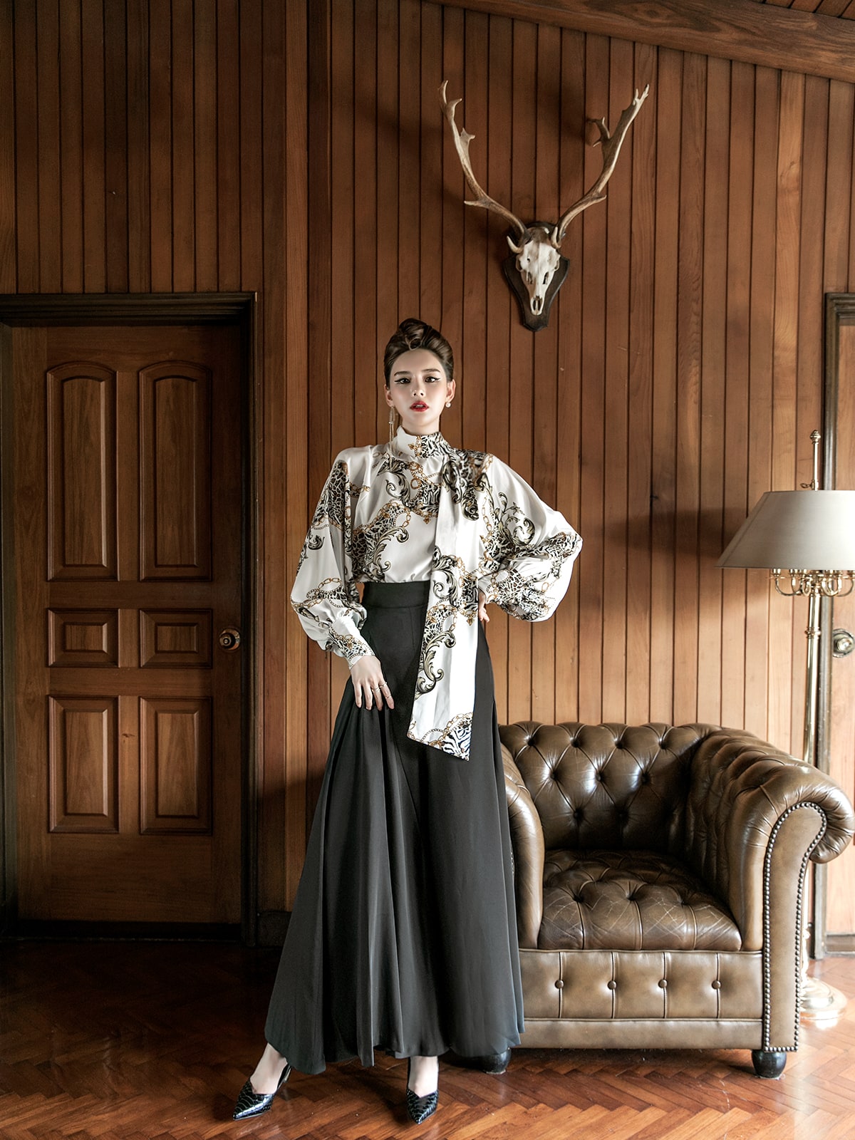 B9010 애니멀 체인 나염 타이 블라우스 Ivory mix