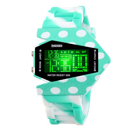 -. Feature : Fashionable Bomber Watch:This Is A Cool And Unique Watch,Its Shape Is Like A American Fighter With Multifunction Colorful Led Back Light.very Cool And Creative On Your wrist. / Multi-function: Calendar Month / Day / Date, Alarm, Water Resistant,7 Colors Led Display, Back Light, Shock Resistant, Stop Watch. What You Waiting For? This A Great Value Watch.You Don't Want To miss. / 50 mwaterproof: Waterproof watch, Swim, Shower, No problem! Note: Please do not press any buttons in the water. / Accurate time keeping: High quality electronic movement with digital display, And zinc alloy case, High hardness glass mirror,Provide precise time keeping. / Shock resistant, Suitable for both outdoor and indoor activities & sports, Such as running, Climbing, Ect
