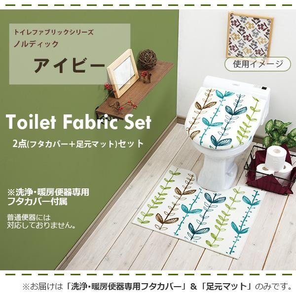 | トイレファブリックシリーズ「ノルディック」のアイビー柄。洗浄・暖房便座専用フタカバーとトイレ用足元マットの2点セットです。 |