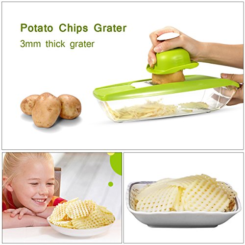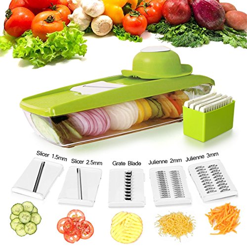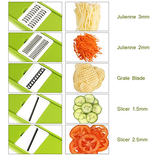 5 Multipurpose Grater: 5 different kind of interchangeable stainless steel blades, it can create 5 types of vegetable slices/julienne ( 2.5m slicer, 1.5mmslicer, 2.0mm&3.0mm Julienne, one grate blade). This one is easy to use and will cut your prep time in half, by cutting through potatoes, onions, carrot and vegetables with ease.