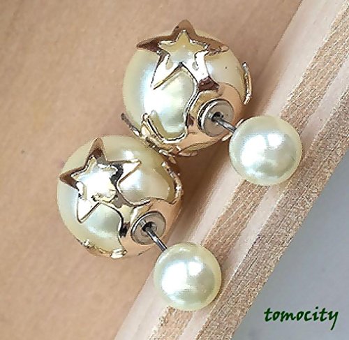 -. Feature : 耳たぶの前と後ろのパールボールが可愛いダブルキャッチピアスです / キャッチ部分のパールボールの表面にはゴールドの星型枠がアクセントされクールな雰囲気です / 前面部の球径:およそ 7 mm / キャッチ部の球径:およそ 12 mm