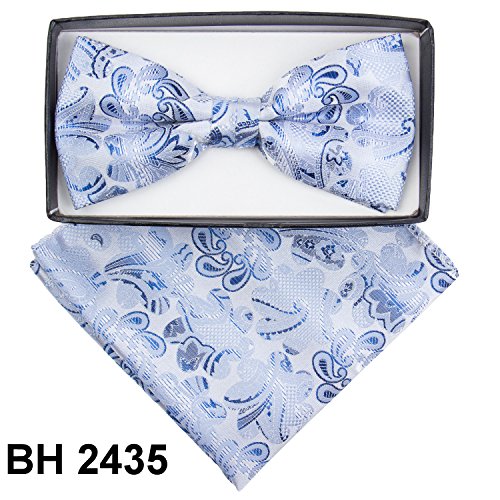 -. Title : Men's Silver Blue Paisley Floral Pre Tied Bow Tie & Pocket Square Hankie Gift Set