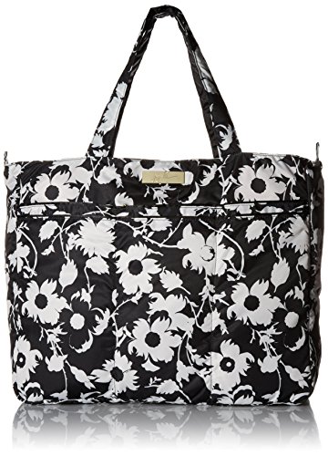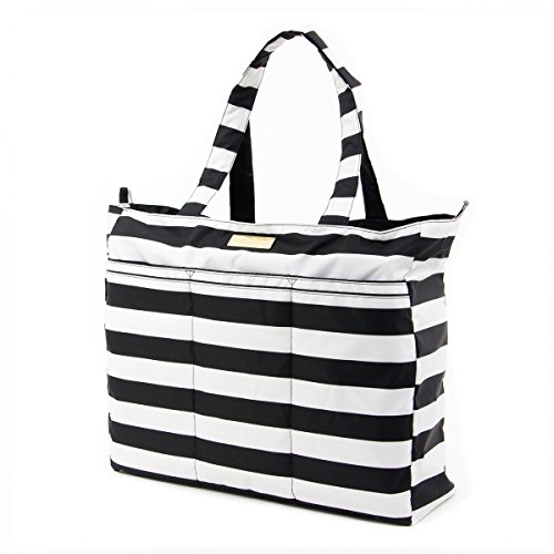 The Ju-Ju-Be Legacy Collection Super Be Zippered Tote Diaper Bag is chic, smart, ultra-light and functional with extra pockets for added versatility. This tote has SUPER powers! It’s SUPER cute! It’s SUPER light! It’s SUPER stuffable! It’s SUPER versatile! Does it have X-Ray vision? No, but its zippered top will help you get through the X-ray machine at the airport faster than a speeding bullet. The Super Be’s inner lining is protected with an Agion natural antimicrobial treatment that inhibits and reduces the growth of odor-causing bacteria, mold and mildew. The outer fabric is treated with Teflon fabric protector, making it easy to repel stains and keep the Super Be clean. In addition to the spacious interior, the Super Be has (7) additional pockets for keeping you ultra-organized and a 12-inch drop strap. The front of the Super Be has (3) extra pockets, (2) of which are tall enough to hide your water bottles, and a center zipper pocket for your smartphone or car keys. The main zippered section is large enough for diapers, wipes, extra clothes, soft toys and other items needed. Inside the bag there are (2) interior mesh pockets and an extra-long attached key clip. The large back pocket is perfect for magazines or your children's books and is designed with a snap closure. This bag is machine washable and measures 18-inches by 15-inches by 5.5-inches in size. The First Lady print is black and white stripes with tan lining. The print is accented by gold, metal hardware. All Ju-Ju-Be Bags come with a Lifetime Limited Warranty against manufacturing defects when purchased from an Authorized Ju-Ju-Be Dealer. Authorized Dealers can be found in the images. Founded in 2005, Ju-Ju-Be is a Southern California company that uses science, style, and attitude to create diaper bags, purses and other fashionable accessories. Ju-Ju-Be assimilated the most advanced technology possible to create a stylish and intelligent product line that's unrivaled in the industry.Feature