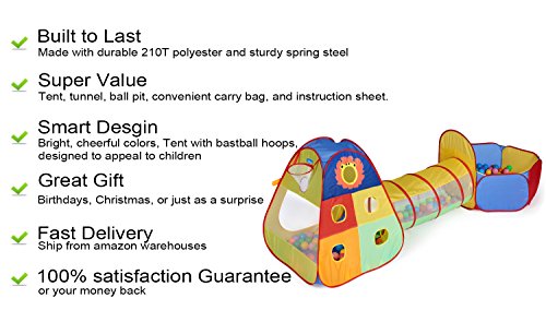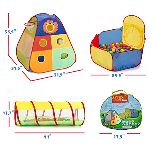 Studio : UTEX Publisher : UTEX Binding : Toy Product Description Watch your children have hours of fun with this cheerful Play House Tent Tunnel! Just let it popup and your little one will love to make memories with this play ball pit by crawling, jumping ,shooting or lying down inside it.For the safety of your children, our tents are meet USA CPSC Toy Safety Guidelines and lead and phthalate free so they're safe for your children to play in MANY DIFFERENT WAYS TO PLAY 1) Use the tents on their own, as a castle or as a playhouse. 2) Use the tunnel by itself for kids to crawl through. 3) Fill the ball pin with balls let them jump play to their hearts content. 4) Combine the tunnels with the tents for 2 separate play areas. 5) Combine the tunnel with the ball pin or the playhouse. 6) Combine all 3 pieces for lots of fun, good for when friends come over. MORE THAN A PLAY TENT: ★Develops Fine Motor Skills. ★Stimulates the Imagination . ★Cultivates an Independent Personality. ★Practice Color Perception and Differentiation. ★ Develop Coordination, and Logical Thinking, and Pattern Recognition. ★Provides Fun "Connecting" Time.