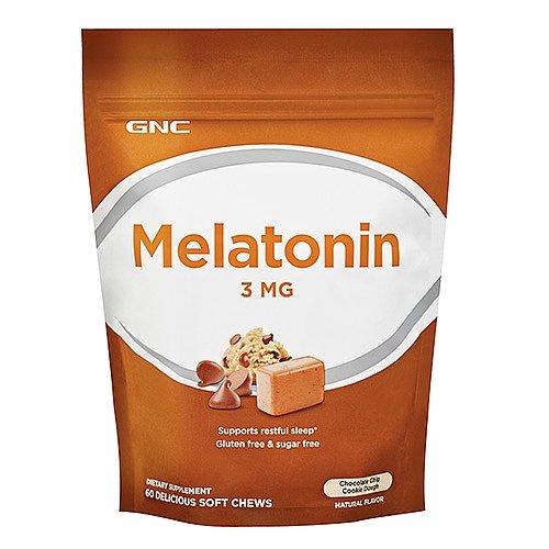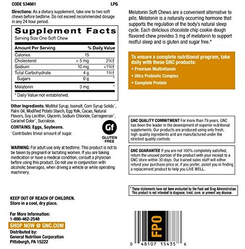 -. Binding : Health and Beauty -. Brand : GNC -. EAN : 0048107154356 -. Feature : Melatonin Soft Chews Are A Convenient Alternative To Pills. Melatonin Is A Naturally Occurring Hormone That Supports The Regulation Of The Body's Natural Sleep Cycle. Each Delicious Chocolate Chip Cookie Dough Chew Provides 3 Mg Of Melatonin To Support Restful Sleep And Is Gluten And Sugar Free. -. IsAdultProduct : 0 -. Label : GNC -. LegalDisclaimer : WARNING: For adult use only at bedtime. This product is not to be taken by pregnant or lactating women. If you are taking medication or have a medical condition, consult a physician before using this product. Do not use in conjunction with alcoholic beverages, when driving a vehicle or while operating machinery.CONTAINS: Eggs and Soybeans. Contributes trivial amount of sugar. -. Manufacturer : GNC -. MPN : No Part Number -. PackageQuantity : 1 -. PartNumber : No Part Number -. ProductGroup : Health and Beauty -. ProductTypeName : HEALTH_PERSONAL_CARE -. Publisher : GNC -. Size : 60 servings -. Studio : GNC -. Title : GNC Melatonin 3 MG Chocolate Chip Cookie Dough 60 chews -. UPC : 048107154356