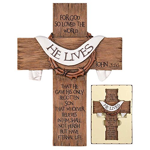 He Lives Sash And Crown Cross Ridged Wood Look 7 x 9 Resin Stone Wall Sign Plaque