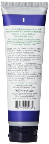 -. Binding : Misc. -. Brand : SynergyLabs -. Feature : Petroleum and Petrolatum-free for cats'delicate digestive system / Specially formulated to aid in the elimination and prevention of common hairballs in cats and kittens / Easy-to-use -. Label : SynergyLabs -. Manufacturer : SynergyLabs -. PackageQuantity : 1 -. ProductGroup : Pet Products -. ProductTypeName : PET_SUPPLIES -. Publisher : SynergyLabs -. Studio : SynergyLabs -. Title : SynergyLabs Richard's Organics Chicken Flavored Hairball Remedy; 4.25 oz.