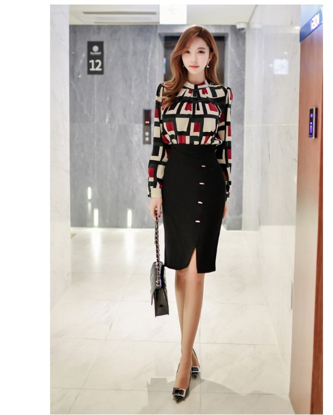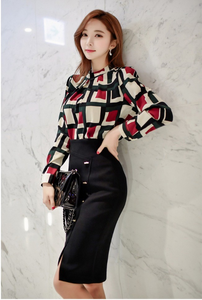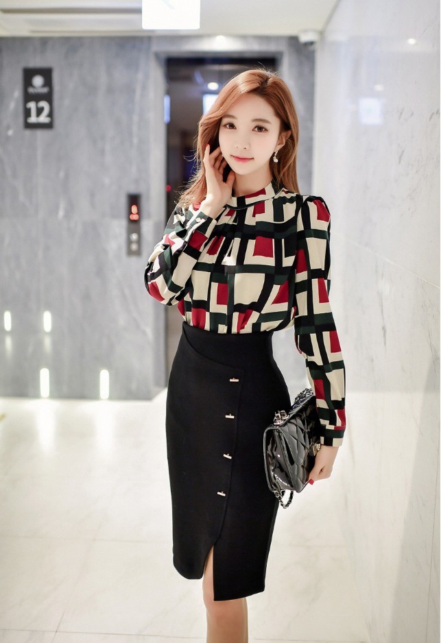 商品名:シャツ ブラウス ハイネック 長袖 柄 パフスリーブ