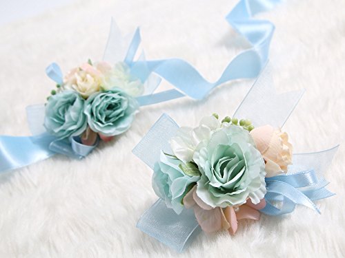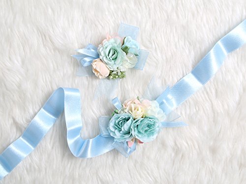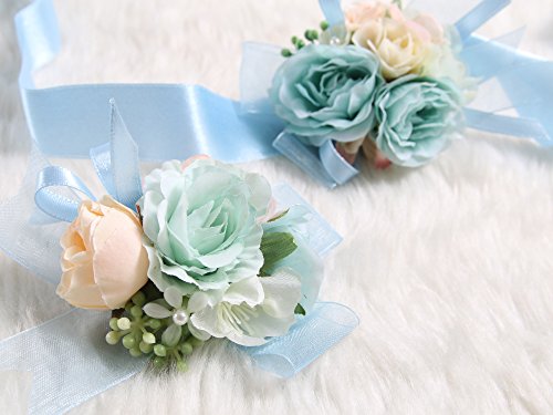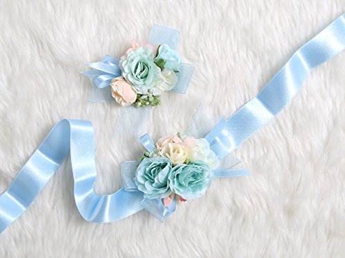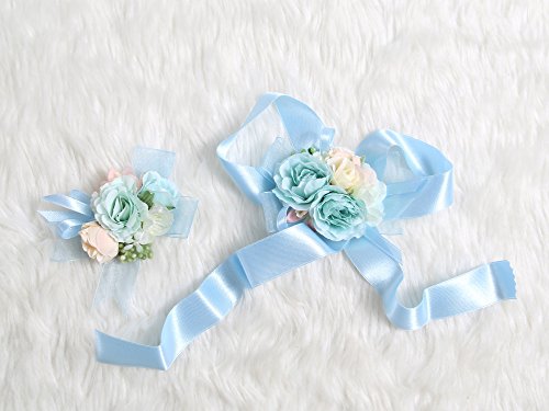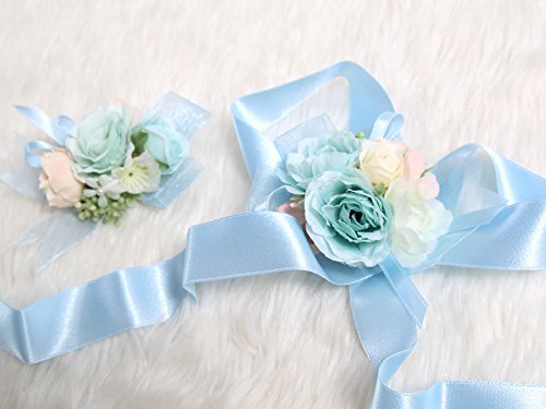 Petite Prom Wrist Corsage Silk rose and Boutonniere Set Pin Ribbon Included (Pale Blue theme)