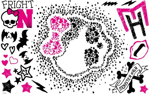 These spooky and sweet black, pink, and white Monster High wall decals (25"x26") will drive fans wild! These fun wall stickers can be applied to any smooth surface, and are fully removable and repositionable without damage or sticky residue. Stick them up on walls, doors, windows, or even on laptops and lockers, and remove them whenever you need a change. Only available in the continental U.S and Canada. THIS PRODUCT IS PRODUCED ON A TRANSPARENT VINYL FOR A "stenciled" LOOK. WHITE OR LIGHT COLORED WALLS ARE RECOMMENDED FOR BEST RESULTS. © Mattel