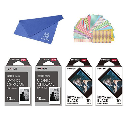 Fujifilm Instax Mini Instant Film 4-PACK BUNDLE SET , Monochrome ( 10 x 2 ) + Black Frame ( 10 x 2 ) + Original Cleaning Cloth + Sticker for Mini 90 8 70 7s 50s 25 300 Camera SP-1 Printer