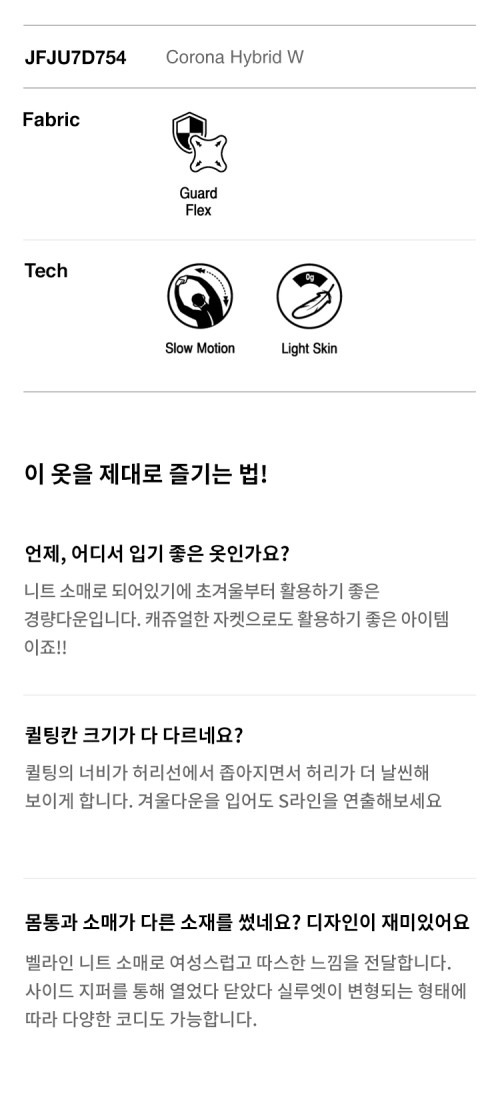 가벼운 덕 다운 충전재를 사용하여 경량의 보온성을 느낄 수 있는 아이템입니다.