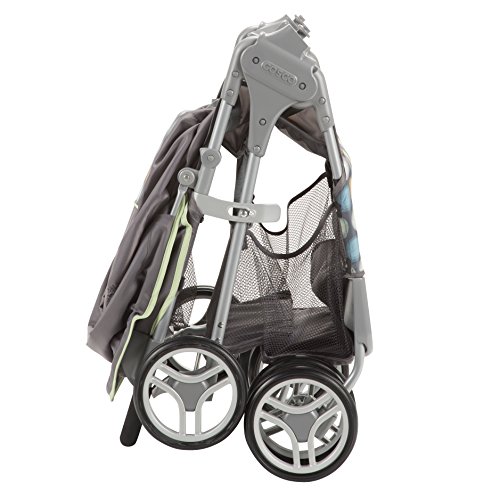 -. Feature : Simply lift up to fold compactly - easy to store or take along for the ride / Parent tray with 2 cup holders and storage tray / Child snack tray with built-in cup holder / Infinite recline / Adjustable canopy