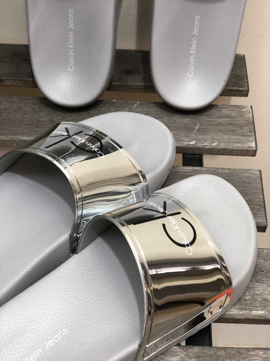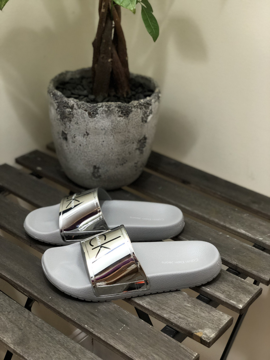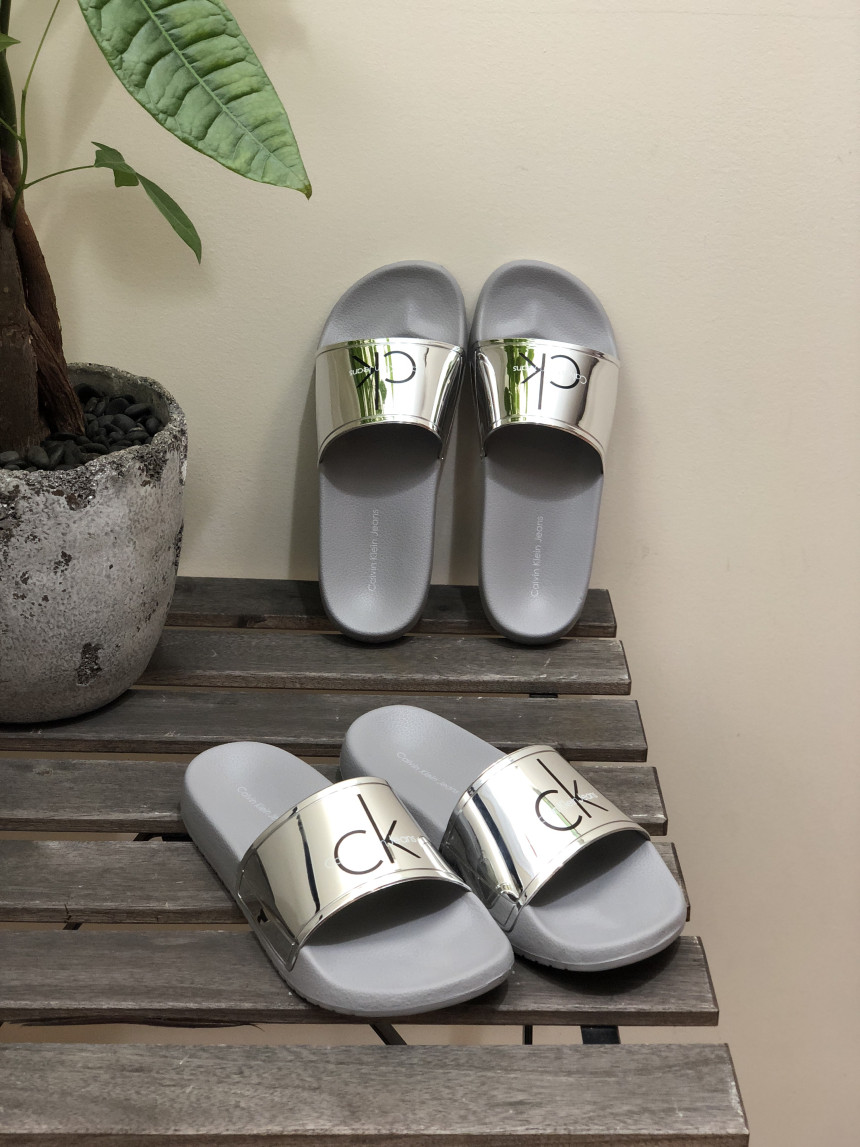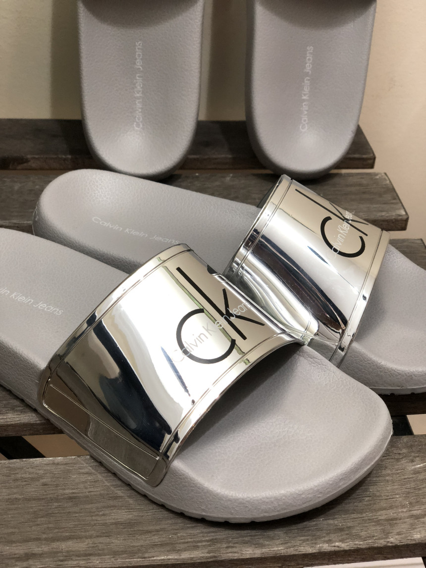 CKのロゴメタリックシルバースライドスリッパ