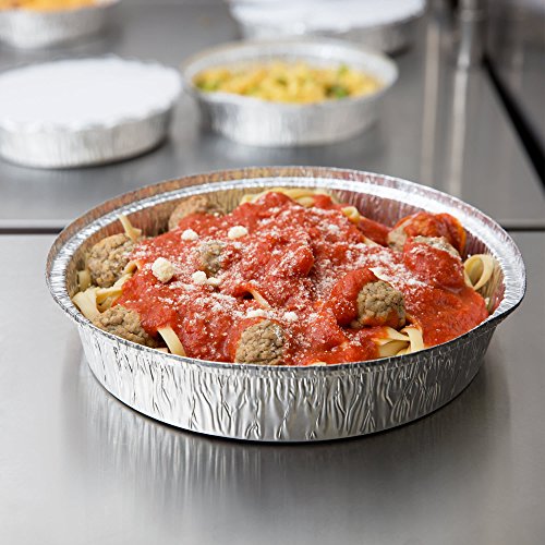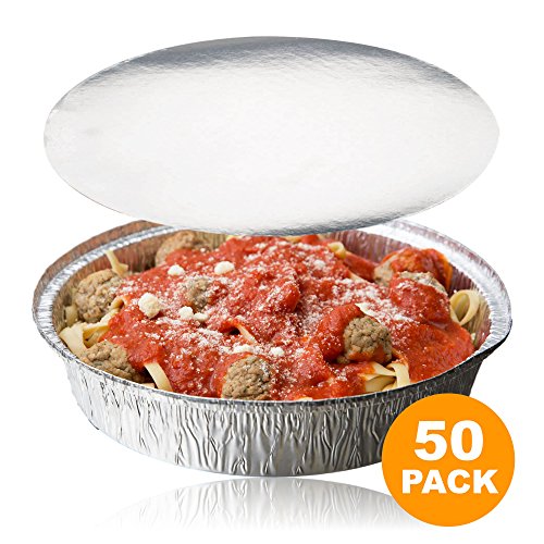 Round 9 Inch Disposable Aluminum Foil Pan Take Out Food Containers with Flat Board Lids, Steam Table Baking Pans, 40 oz, 2.75 lb, 1.25 Quart [50 Pack]