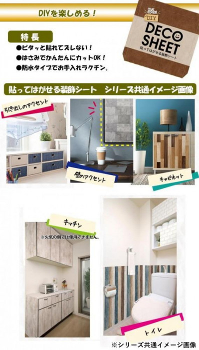 | のり残りなしではがせる日本製の装飾シートです。貼りやすい大きさにカットして使用できます。防水性に優れているので、キッチンや床、壁など自分好みに変えたいという方におすすめです!! |