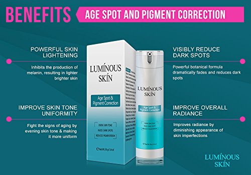 -. Feature : POWERFUL SKIN LIGHTENING: Inhibits the production of melanin, resulting in a lighter brighter skin / VISIBLY REDUCE DARK SPOTS: Powerful botanical formula dramatically fades and reduces dark spots / IMPROVE SKIN TONE UNIFORMITY: Fight the signs of aging by evening skin tone & making it more uniform / IMPROVE OVERALL RADIANCE: Improves radiance by diminishing appearance of skin imperfections / MOISTERIZE WHILE YOU BRIGHTEN: Unique formulation will moisturizes skin leaving it soft & smooth