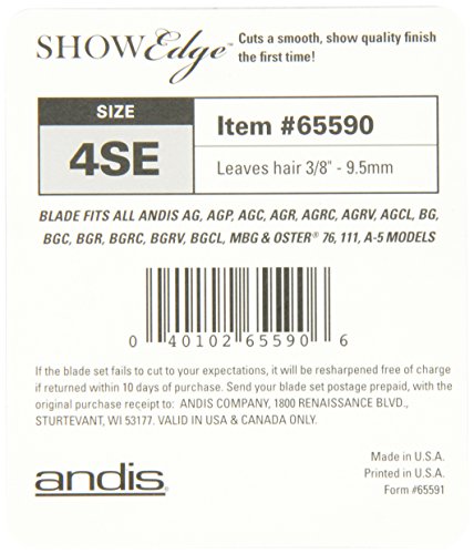 Studio : Andis (Pet) Publisher : Andis (Pet) Binding : Misc. Product Description Chrome plated, carbon-steel edged blade set for Andis detachable blade clippers. Andis has developed a blade that out-performs any on the market. SHOWEdge was designed to create the smoothest finish possible on a dog's coat without leaving tracks from the blade in the hair. This revolutionary blade was engineered to require fewer passes through the hair, saving you valuable time and money. Size 4 Leaves Hair 9.5mm (3/8"). 0