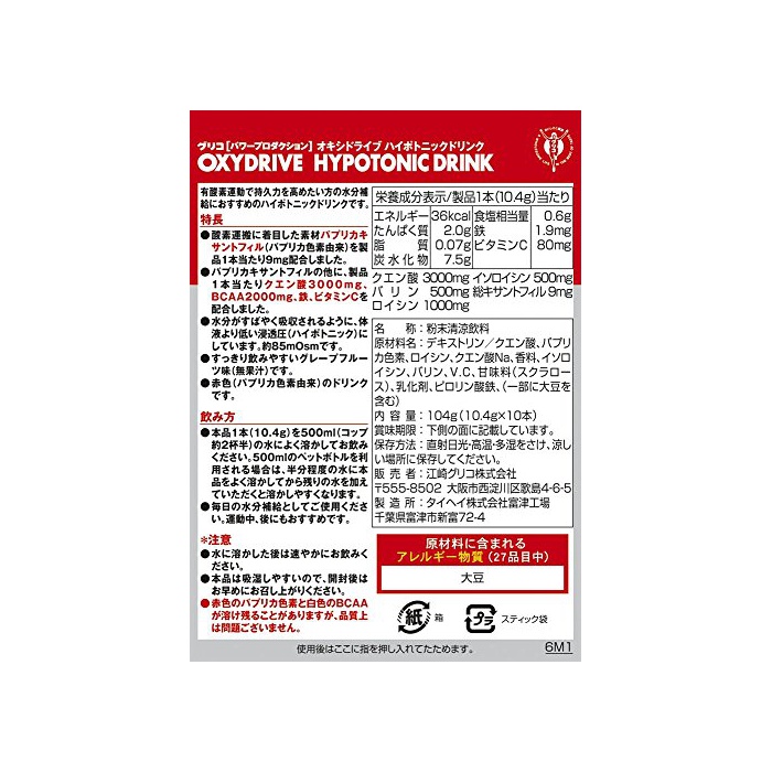 원본상품명:グリコ パワプロダクション オキシドライブ 呼吸持久系ハイポトニック粉末ドリンク グレプフルツ味 1本(10.4g) 10本