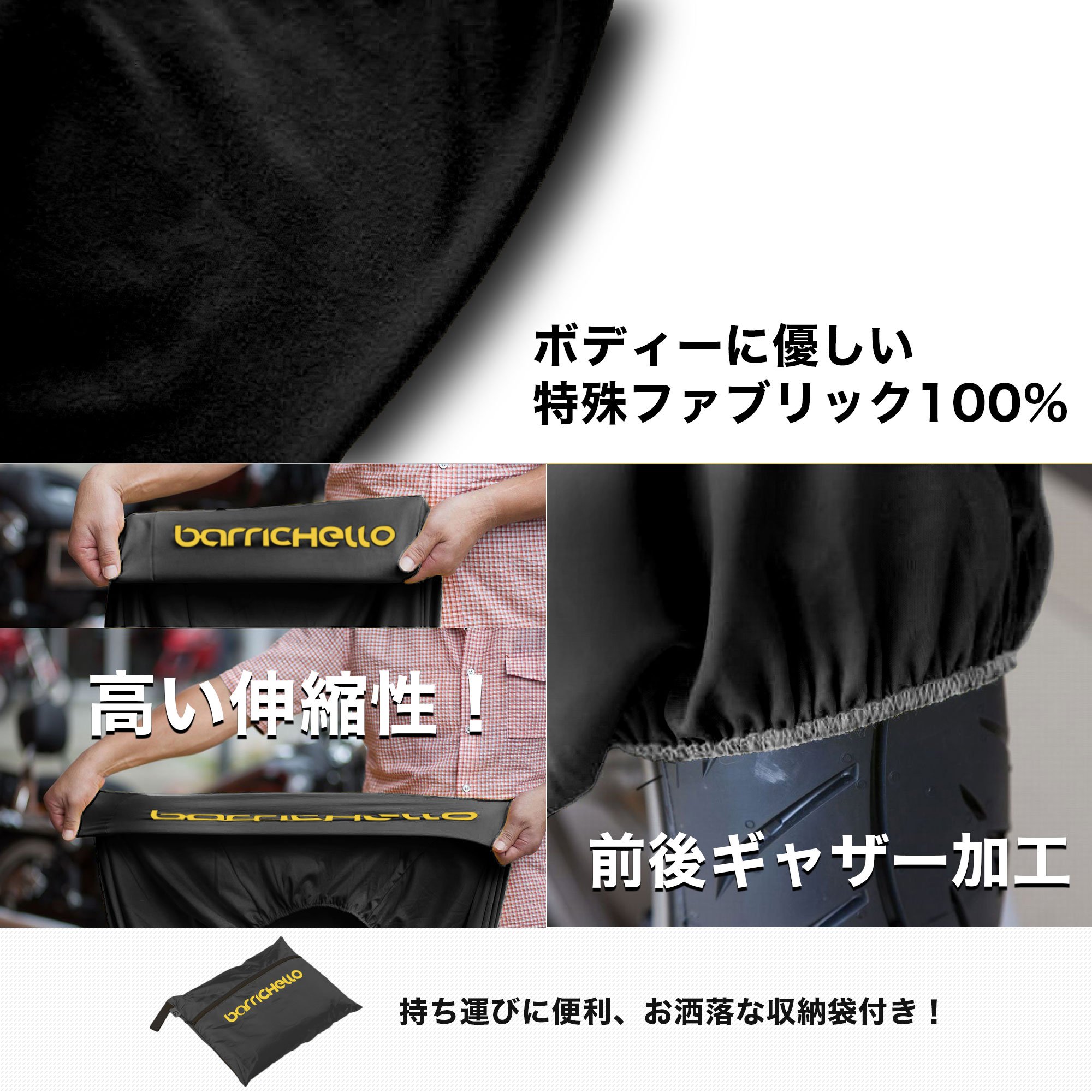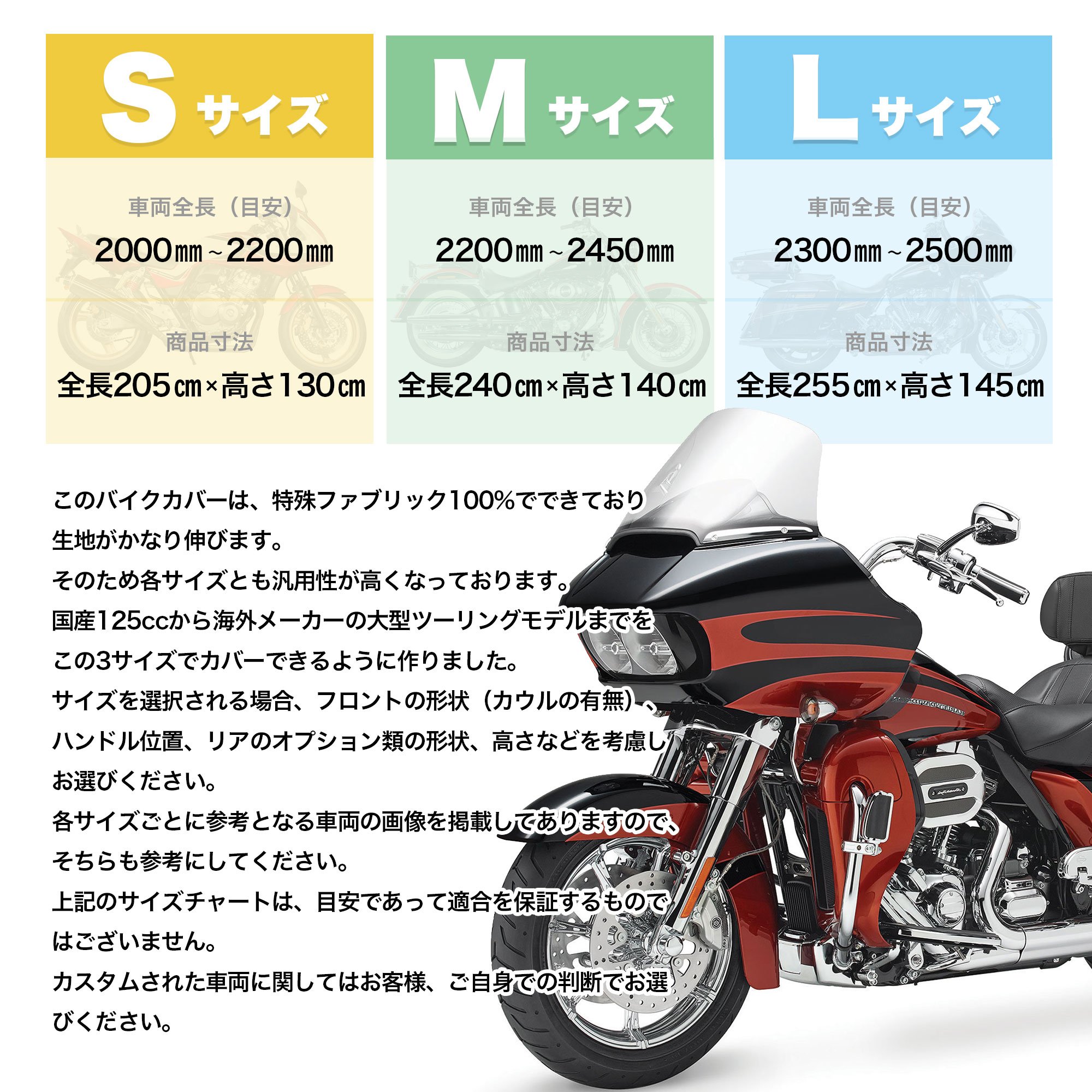 〇 Adopting a stretchable fabric to cover three sizes from S, M, L from domestic 125cc to full-scale manufacturers' full-scale tooling model, full cover!