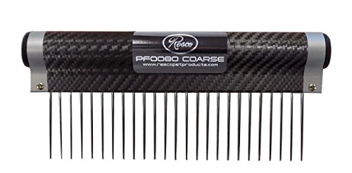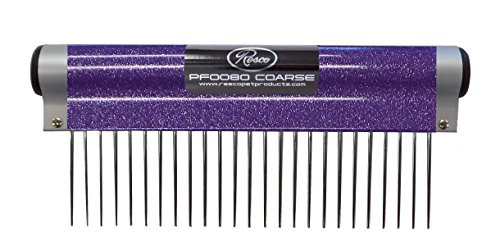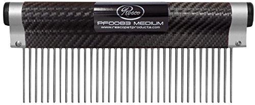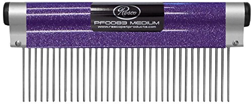 The American made #80 ergonomic comb has been a staple for professional groomers since its inception in 1953. The 6 inch handle is made of American anodized aluminum and contoured to perfectly fit the hand, reducing wrist strain and fatigue. Due to its strong yet lightweight design, the #80 comb is a powerful tool for any Groomer or pet owner. The comb features 1½” precision nickel plated hardened steel pins pressed into a solid brass shank making broken and bent pins a thing of the past. The comb teeth are tapered to get into your pet’s coat easier and their rounded tips protect your pet’s skin, making grooming an enjoyable bonding time instead of a chore. The Resco #80 comb is available with either coarse (PF0080) or medium (PF0083) tooth spacing. Also available is the 7” combination comb (PF0093), with both medium and fine spacing to meet all your grooming needs.