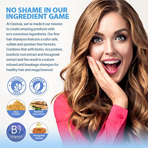 - NO SHAME IN OUR INGREDIENT GAME – At Osensia, we’ve made it our mission to create amazing products with eco-conscious ingredients. Our fine hair shampoo features a color safe, sulfate and paraben free formula. Combine that with biotin, rice protein, burdock root extract, and fenugreek extract, and the result is a nature-infused anti breakage shampoo for healthy hair and mega bounce!