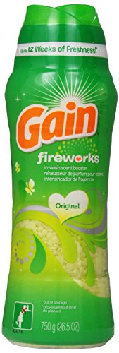 ReleaseDate : 2014-05-20 Studio : Procter Gamble - Household/Laundry/Food Publisher : Procter Gamble - Household/Laundry/Food Binding : Health and Beauty Product Description Gain Fireworks In-Wash Original Scent Booster 26.5 Oz. Create explosions of scent in your washer with Gain Original Fireworks. The in-wash booster lets you pick just how much scent you enjoy. Shake as many scent beads as you'd like into your washer drum before you start the wash, and then add your favorite Gain detergent. Toss in your clothes, and start the wash. Gain Fireworks dissolve in hot or cold water. Enjoy the smell of a job well done. 0