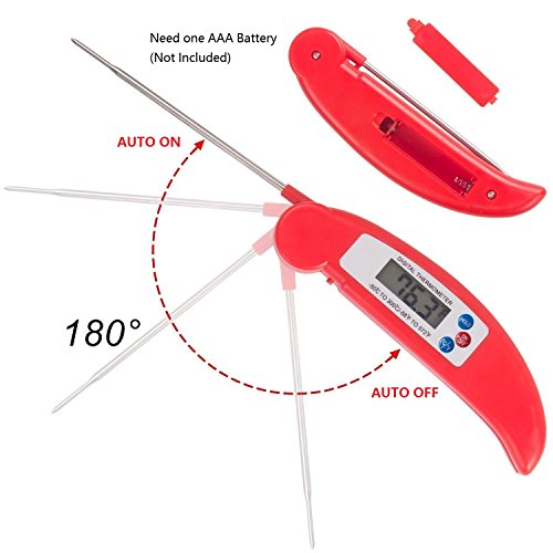 - SMART DESIGN: Auto-shut off to save battery life if readout stays for 10 minutes. Needs one 1.5V AAA battery (Not Included). Just simply pull out the probe, insert into your food or liquid and then it reads the temperature.